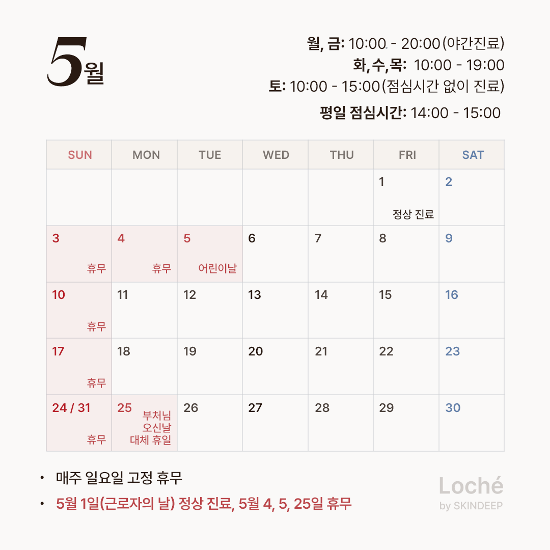 로체의원 5월 진료 일정 안내 미분류 로체의원 5월 진료 일정 안내 Return to Your Natural Light,피부 본연의 건강한 빛을 가장 중요하게 생각하는광나루역 피부클리닉 로체의원입니다. 🗓️ 5월…관리자2026년 04월 20일