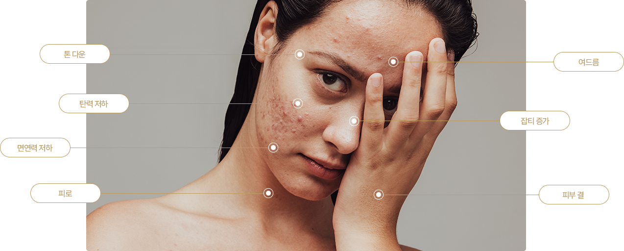 피부 탄력 저하, 톤 다운, 잡티 증가 등 피부의 변화로 나타납니다.