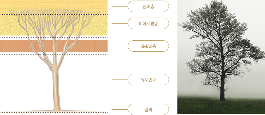 얼굴이 무너지지 않도록 잡아주는 힘은 근막과 유지인대가 담당합니다.