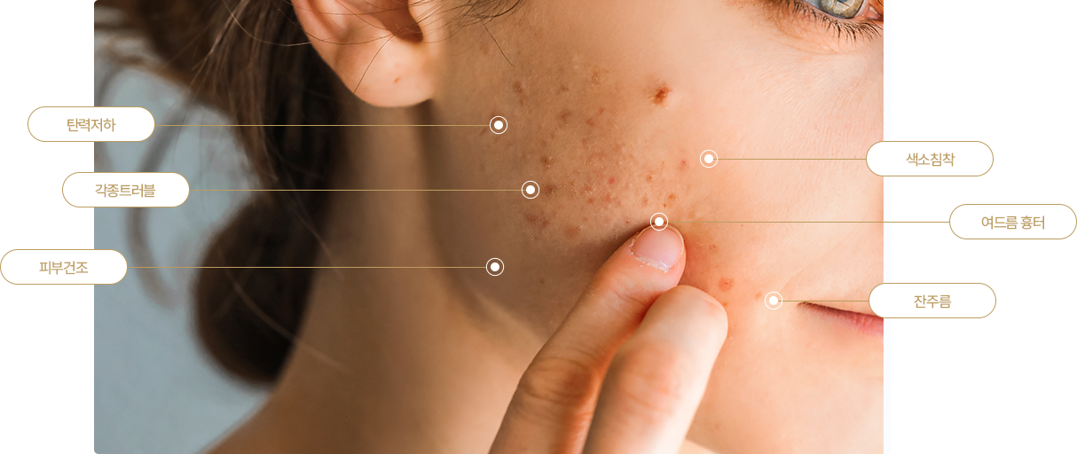 이러한 변화는 주름, 색소침착, 홍조, 여드름 흉터 등의 문제로 나타나게 됩니다.